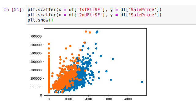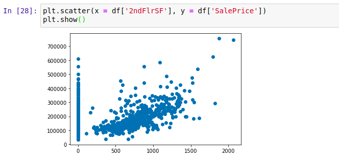And as you can see we created a scatter plot above with the x-axis a the column 2ndFlrSF and the y-axis column SalePrice. And as seen in the graph we can say that the more the value of 2ndFlrSF more the value of SalePrice. But there are houses that don’t have the 2nd floor that’s why there are so many points on x = 0.